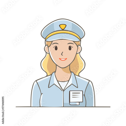 woman, uniform, cap, hat, blond, hair, blonde hair, badge, service, men at work, female, girl, person, professional, employee, occupation, job, business, work, cartoon, illustration, graphic, drawing, vector, flat, style, icon, design, smiling, friendly, kind, positive, service industry, public service, delivery, delivery person, official, officer