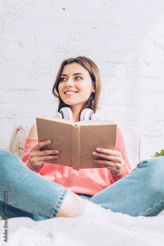 beautiful, happy, sitting, smiling, happiness, cheerful, caucasian, smile, emotion, pose, resting, home, woman, emotional, read, reading, book, education, indoor, earphones, attractive, positive, relaxing, daylight, shadow, daytime, copy space, one person, young adult, looking away