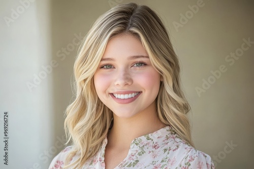 Smiling Woman Portrait with Blonde Hair and Floral Shirt
