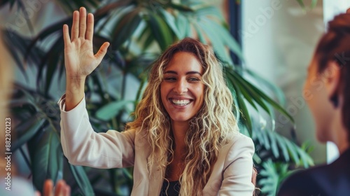 woman, smiling, blond, hair, hand, raising, conversation, friends, background, green, plant, casual attire, happy, positive, meeting, indoor, office, business, professional, formal, jacket, white, sitting, talking, listening, gesticulate, communication, interaction, enthusiastic, bright, light, relaxed, friendly, joyful, natural, sharpened, energetic