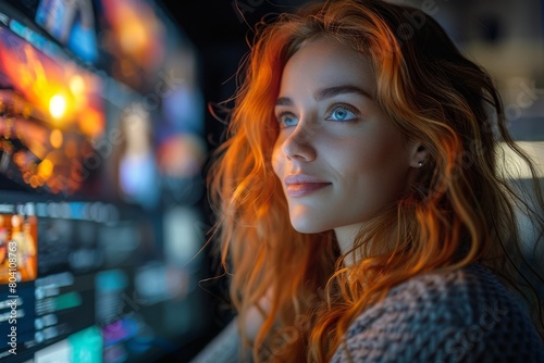 Smiling woman with blue eyes and orange hair illuminated by glowing screens at night
