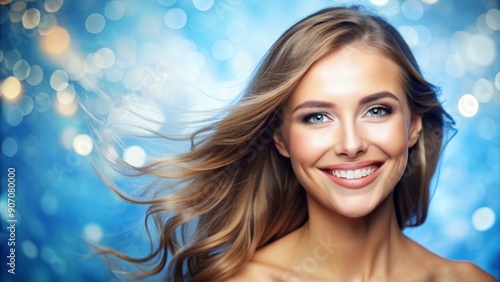 Smiling Woman with Flowing Hair on Blue Bokeh Background, portrait, beauty, happy, woman, model