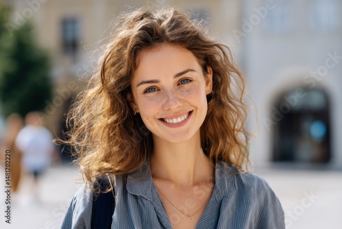 woman, smiling, portrait, freckle, curly hair, happy, city, day, sunlight, outdoors, urban, person, young adult, one person, casual attire, posing, style, building, background, female, european, girl, face, hair, blue eye, expression, joy, positive, cheerful, lifestyle, closeup, content
