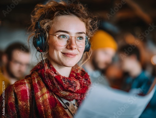 woman, script, earphones, film, motion picture, production, actor, actress, reading, smiling, set, crew, scene, industry, entertainment, goggles, group, colleague, working, together, sharpened, portrait, artistic, casual attire, creative