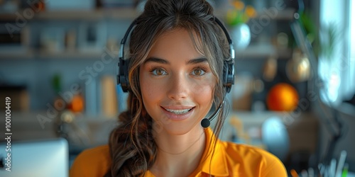 woman, earphones, smiling, portrait, headset, female, office, desk, business, communication, client, service, support, technology, call, center, operator, professional, help, employee, computer, work, men at work