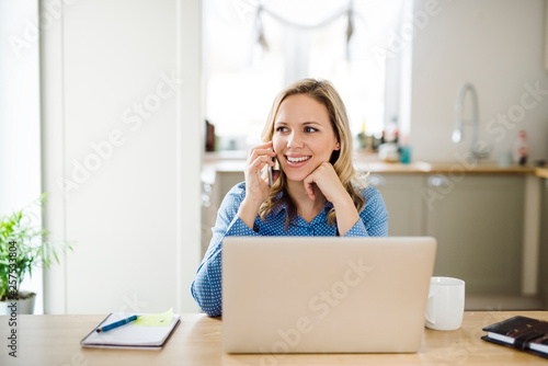 laptop, cell, working, home, computer, cyberspace, connection, business, freelance, smile, online, single, talking, blond, wireless, home office, lifestyle