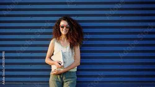 smiling woman with laptop poses confidently against blue corrugated wall. casual style with sunglasses embodies modern tech-savvy lifestyle. perfect for business or lifestyle themes