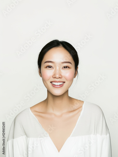 woman, smiling, confidence, portrait, white, blouse, black, hair, joyful, positive, light, background, beauty, happiness, natural, casual attire, friendly, asian, cheerful, elegant, simple, bright, fresh, relaxed, serene, expressive, youthful, skin, fashion, style, closeup, head shot, emotion, warmth, lifestyle, photo, studio, clean, minimalistic, soft, radiant, charming, approachable, modern, glowing, look, healthy, expression, candid