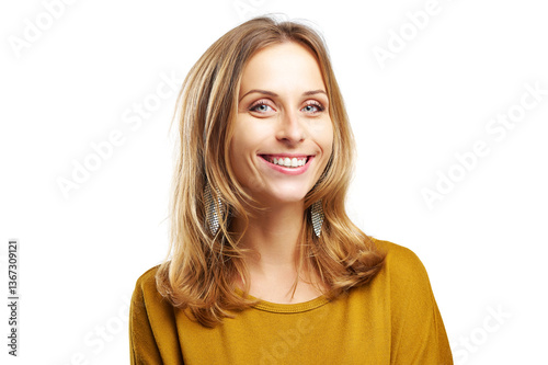 smile, smiling, female, woman, blond, happy, white background, portrait, cheerful, long hair, positive, joy, friendly, expression, happiness, face, beauty, person, people, laughing, satisfaction, pleasant, model, calm, bright, optimistic, style, youthful, warmth, bliss, glad, good mood, gentle, engaging, fresh, exuberant, gleeful, elated, charming