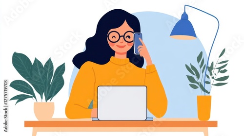 woman, laptop, phone, desk, work, home, office, plant, smiling, yellow, sweater, blue, lamp, technology, communication, business, professional, modern, illustration, flat, design, graphic, indoor, workspace, happy, digital, remote, freelancer, entrepreneur, productivity, lifestyle, cosy, comfortable, female, adult, concentrated, focused, calm, serene, positive, content, peaceful, relaxed, efficient, successful, connected, cyberspace