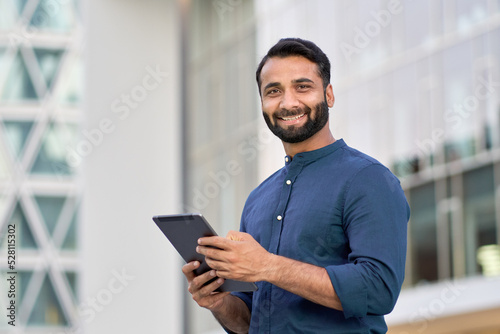 Smiling young adult indian business man professional executive holding digital tablet online fintech outside, happy eastern businessman ceo using pad standing outdoors in big urban city street.