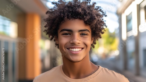 student, college, black, man, young, curly, hair, smiling, peach, casual attire, campus, education, university, african, youth, joy, happiness, academic, photogenic, confident, cheerful, friendly, natural, morning, lifestyle, teenage, positive, optimistic, male, diverse, sunlight, warm, glow, portrait, urban, fashion, t-shirt, authentic, success, learning