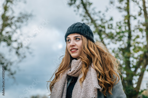 Smiling young blonde woman with a woolly hat breathing fresh air in the middle of nature