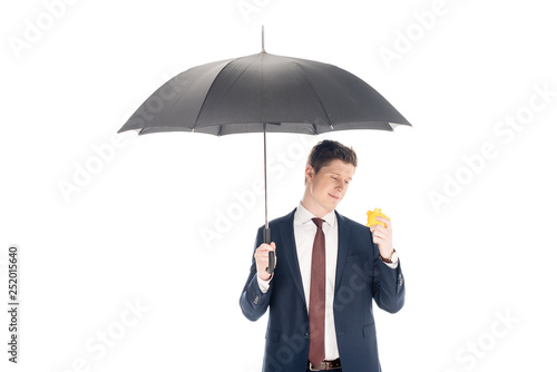 smiling young businessman with umbrella looking at piggy bank isolated on white
