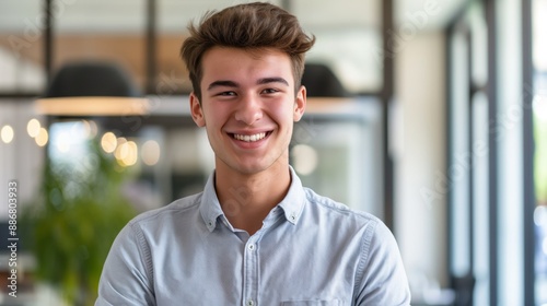 Smiling Young German Man in Casual Shirt, Modern Office Background, Professional Portrait for Career and Business Use