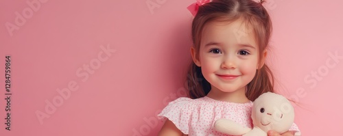 Smiling young girl holding a stuffed toy against pink background