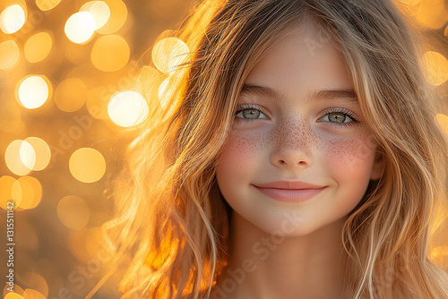Smiling young girl with blonde hair in soft golden lighting