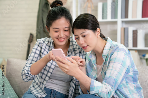 Smiling young lady friends enjoying watching mobile video on mobile phone sitting on sofa at home. positive teenage girl holding smartphone showing funny online photo to sister spend weekend together