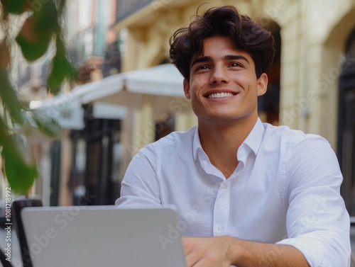 smiling, young, latin, businessman, laptop, happy, guy, student, professional, looking away, searching, thinking, technology, digital, connection, communication, entrepreneurship, freelance, modern, casual attire, urban, lifestyle, skilful, focused, cyberspace, successful, career, portrait, diversity, contemporary, learning, education, job market, creativity, innovation, confidence, progress, motivation, leadership, ambitious, multicultural