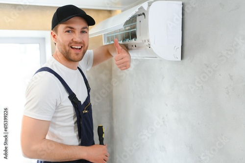 Smiling young male electrician repair conditioner in client home. Man mechanic or repairman fix filters in air condition device at customer house