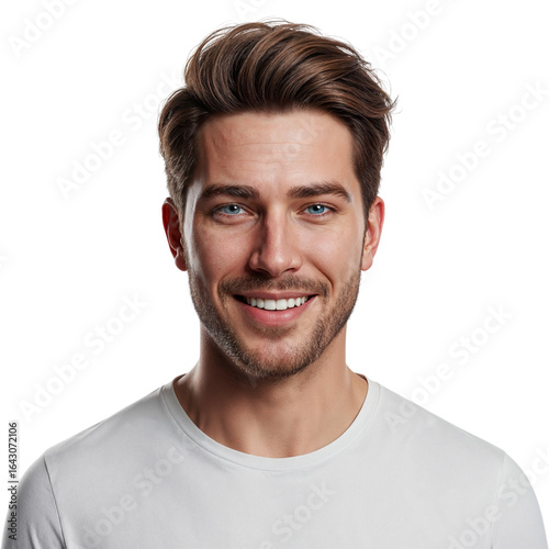 man, male, young, adult, caucasian, white, person, human, portrait, head shot, face, smile, smiling, happy, joyful, positive, confident, photogenic, attractive, coiffure, hair, beard, facial, t-shirt, clothing, apparel, casual attire, studio, isolated, background