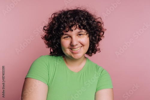 Smiling young person poses in front of pink background while wearing a green shirt and showing cheerful expression for casual portrait