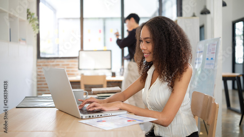 businesswoman, office worker, technology, laptop, financial, entrepreneur, analysing, attractive, browsing, business, comfortable, communication, confidence, connection, corporate, cosy, employee, designer, african american, document, examining, finance, freelance, contraption, home office, lifestyle, modern, networking, occupation, office, one person, online, paperwork, positive, professional, reading, remote, searching, small business, smiling, successful, surfing, typing, website, wireless, woman, working