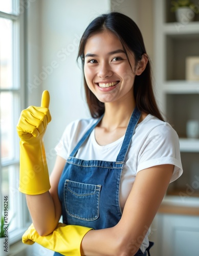 cleaning, woman, cleaner, housekeeper, maid, professional, uniform, apron, glove, yellow, blue, smiling, young, female, domestic, hygiene, service, thumb, gesture, positive, bright, modern, interior, home, house, residential, sanitation, friendly, confident, happy, organisation, clean, cleanliness, occupation, job, lifestyle, attire, work, men at work, employee, person, people, casual attire, assistant, service industry, housekeeping, concierge