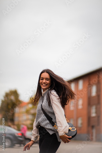 closeup, active, adult, autumn, caucasian, cheerful, city, city life, dancing, female, girl, happy, middle eastern, mixed race, motion, one person, outdoors, park, people, person, portrait, smiling, street, town, walking, woman, young