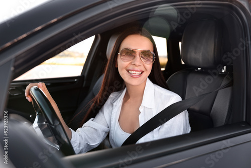 Smiling young woman in sunglasses with seatbelt driving car, view from outside