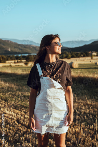 smiling, young, woman, standing, field, landscape, sunset, t-shirt, sunglasses, relaxation, evening, summer, alone, relaxed, happiness, white, rural, attractive, sky, blue skies, sunlight, outdoors, portrait, positive, casual attire, long hair, solitude, looking away, beauty, confidence, rural scene, dungarees, beautiful, nature, remote, 1, people, caucasian, brown hair, goggles, happy, colours, sunshine, atmosphere