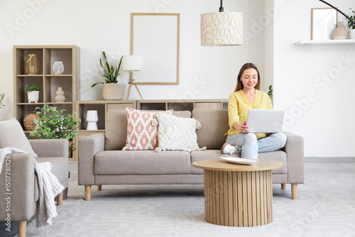 Smiling young woman using laptop on grey sofa in living room