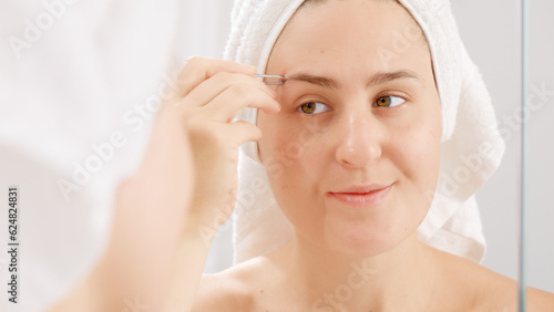 Smiling young woman wearing white towel plucking her eyebrows with cosmetic tweezers. Concept of beautiful female, makeup at home, skin care and domestic beauty industry.