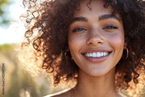 woman, smile, curly hair, outdoors, nature, sunlight, happiness, beauty, joy, portrait, sunny day, greenery, carefree, lifestyle, confidence, vibrant, youth, closeup, enjoyment, serene, cheerful, natural beauty, casual attire, bright, facial expression, summer, freedom, laughter, warmth, aesthetic, connection, calmness, friendly, elegant, engaging, inviting, emotion, candid