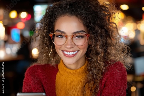 woman, smiling, happy, portrait, curly, hair, goggles, red, cardigan, phone, warm, lighting, bokeh, blurred, background, positive, joyful, young, female, technology, communication, casual attire, indoor, night, city, light, fashion, style, attractive, beautiful, confident, modern, lifestyle, photo, closeup, expression, emotion, face, clothing, accessory, image, photo, picture, visual, media