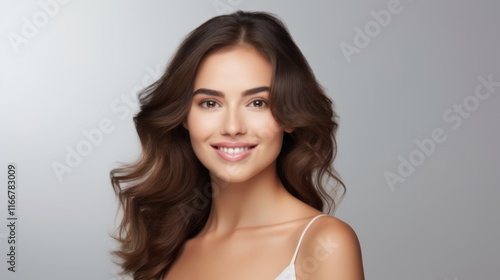 Smiling young woman with long wavy hair poses against a soft gradient background in a natural and light setting