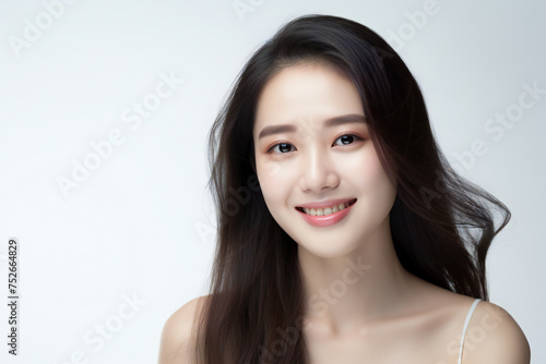 Smiling Young Woman with Radiant Skin and Long Hair: Natural Beauty and Elegant Portrait on White Background