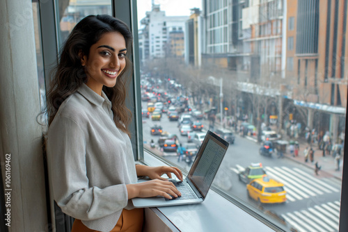 woman, laptop, smiling, office, window, city view, urban, professional, productivity, modern, work, digital, connectivity, young, female, business, career, technology, city landscape, confident, lifestyle, workplace, tech, urban setting, casual attire, people, contemporary, stylish, interaction, traffic, downtown, focused, computer, businesswoman, working, cyberspace, person, home, smile, notebook, typing, success, communication