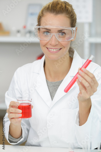 smily female scientific research looking at tube in laboratory