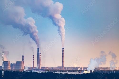 smoke, plant, factory, sky, morning, power, pollution, pipe, industrial, steam, energy, industry, environment, air, chimney, dirty, chemical, technology, global, warming, smog, blue, gas, toxic, ecology, tower, stack, sun