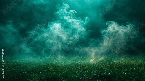 Smoke, green background, dark ground light smell toxic black bad fog stadium smelly fog. Background green grass smoke cloud fart football night stadium dust poison floating sports transparent dirty,