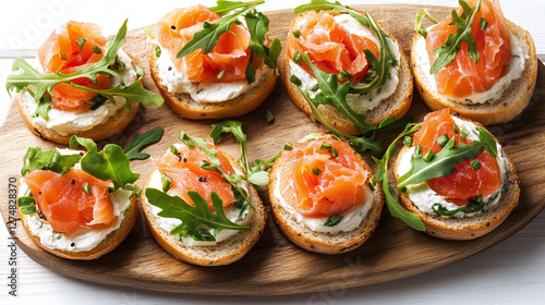 Smoked salmon and cream cheese bagel with arugula isolated on white background.