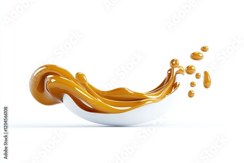 Smooth caramel sauce splashing from a white bowl, with droplets in mid-air, on a clean background