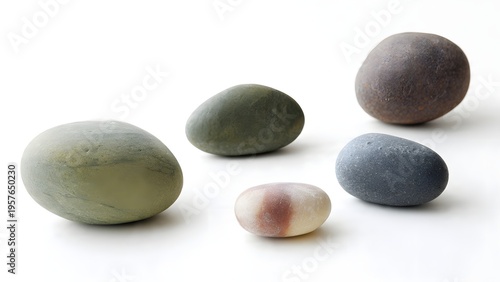 Smooth gray and brown oval stones arranged on white background showcasing natural texture and earthy elegance.