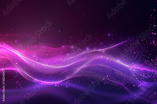 Smooth horizontal purple wave neon light line and particle background. Tech banner design.