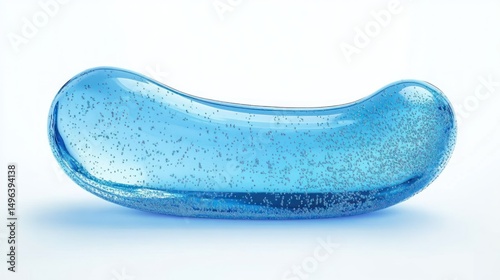 Smooth translucent blue elongated capsule with numerous tiny dark particles suspended within, glowing softly against a clean white background