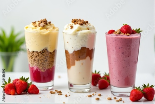 Smoothies layered with superfood powders and fresh fruits in clear jars