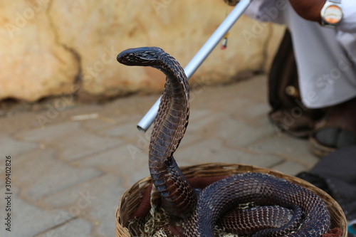 Snake charmer sit and play music for demonstration of the cobra dance outside Amber fort in Jaipur, India