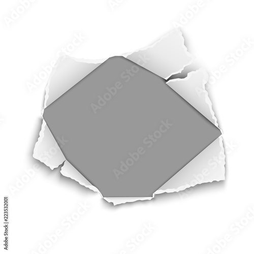 Snatched hole in white paper with torn edges, soft shadow and gray background. Damaged sheet. Vector paper mock-up.