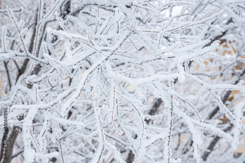 Snow and rime ice on the branches of bushes. Beautiful winter background with twigs covered with hoarfrost. Plants in the park are covered with hoar frost. Cold snowy weather. Cool frosting texture.